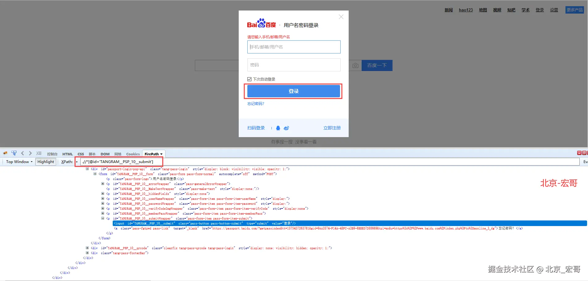 (1)访问百度主页面,点击百度首页的“登录”,xpath定位如下: