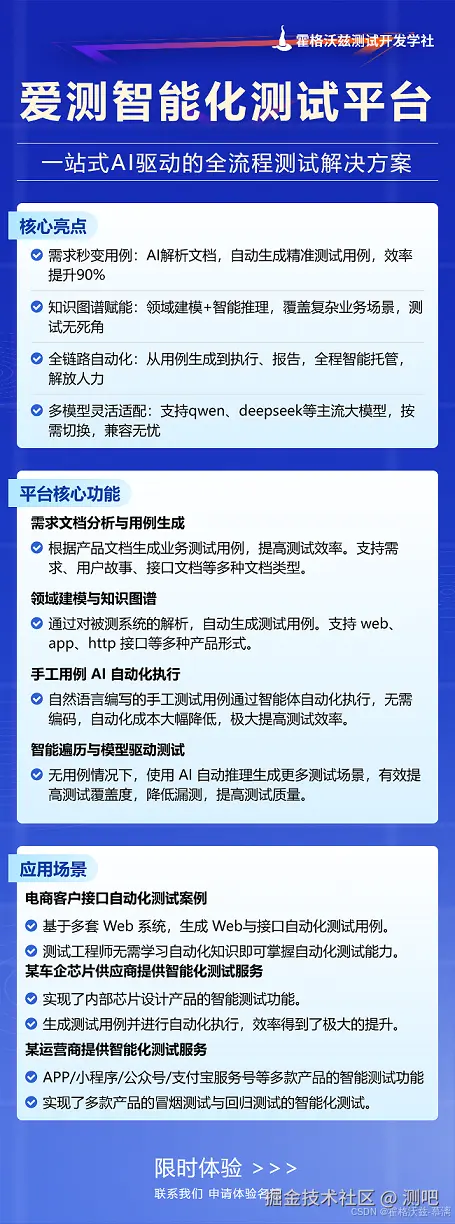 AI测试时代已来,与其观望不如亲自上手!立即免费体验「爱测智能化服务平台」,零门槛开启手工测试用例通过智能体自动化执行、无用例则使用AI自动推理生成更多测试场景等核心功能,10分钟感受AI如何提升你的测试效率。