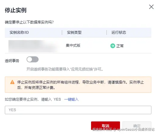 在停止实例弹框,选择是否开启“透明事务”,输入框中按照提示输入“YES”,不区分大小写,单击“确定”,停止实例。