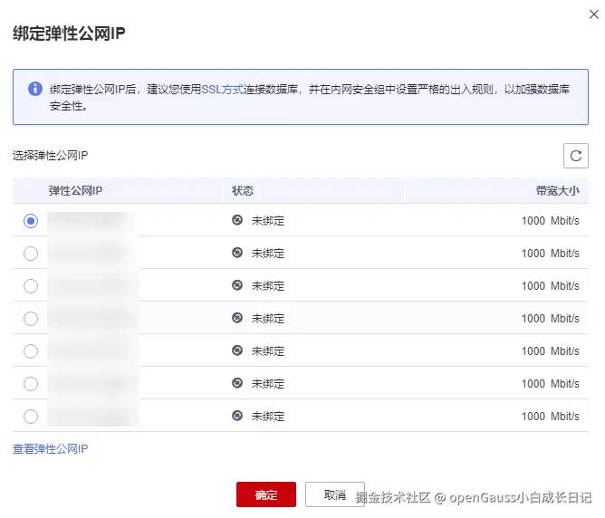 GaussDB实例创建成功后,支持用户绑定弹性公网IP,在公共网络来访问数据库实例,绑定后也可根据需要解绑。