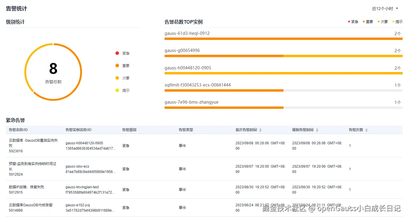 告警总数TOP实例:显示选定时间内未清除告警数量TOP5实例的告警统计。