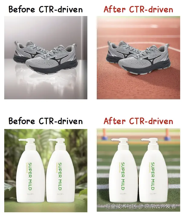 此外,广告图像生成中考虑背景与商品之间的相关性至关重要。现有的强化学习算法仅专注于优化奖励值,忽视了视觉吸引力和背景相关性之间的平衡。这种疏忽可能导致背景与商品不协调,误导用户并导致糟糕的购物体验。如下图所示,虽然动态、运动风格的背景可能会提高运动鞋的点击率,但模型可能错误地将类似的背景应用于化妆品等无关商品,从而破坏视觉和谐性和商品相关性。