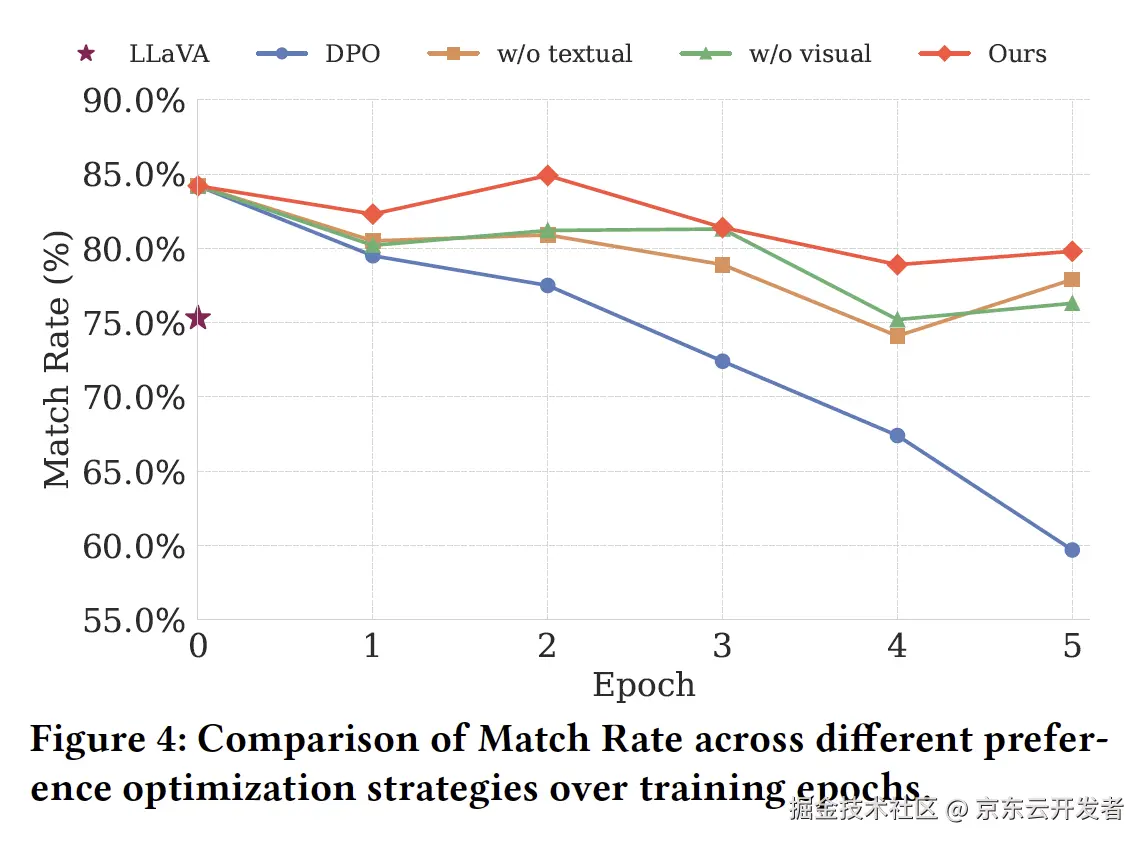 为了确保公平比较,我们在CTR驱动优化过程中使用相同的RM进行CTR反馈,并且训练轮数相同,来评估PCPO与标准DPO的性能。下图展示了两种方法在训练过程中的表现。值得注意的是,标准DPO在训练5个epoch后,匹配率显著下降,从0.842降至0.597。而我们的PCPO则表现出更为平缓的下降趋势,在第5个epoch时保持了0.798的匹配率,这比标准DPO在同一阶段的表现高出33.7%。
