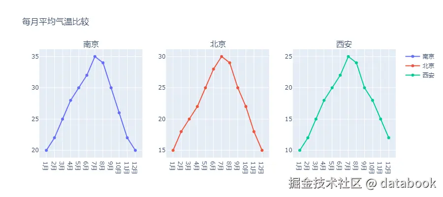 fig.add_trace(go.Scatter(x=months, y=city3, name="西安"), row=1, col=3)