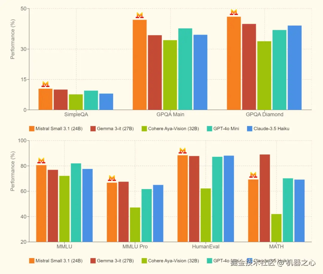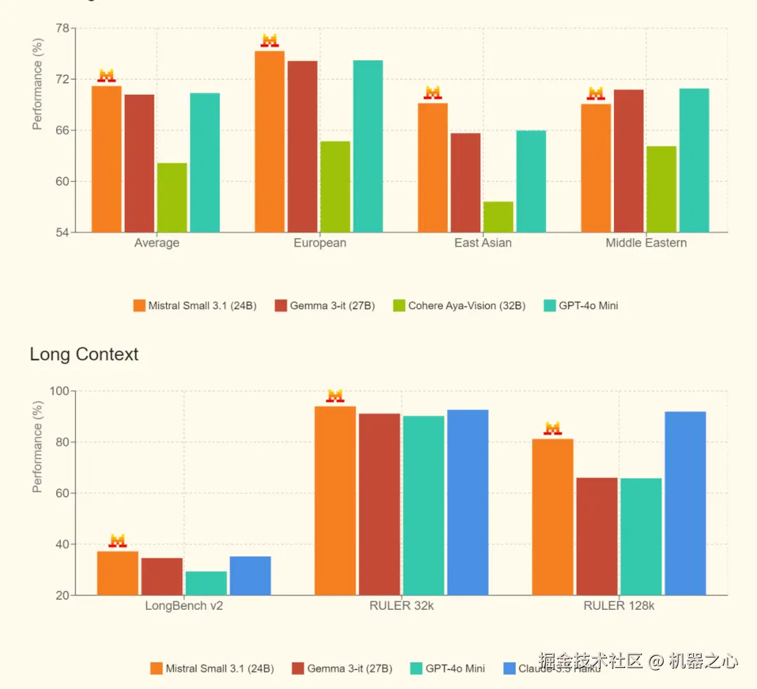 以下是 Mistral Small 3.1 在文本、多模态、多语言、长上下文等场景中的性能表现情况。