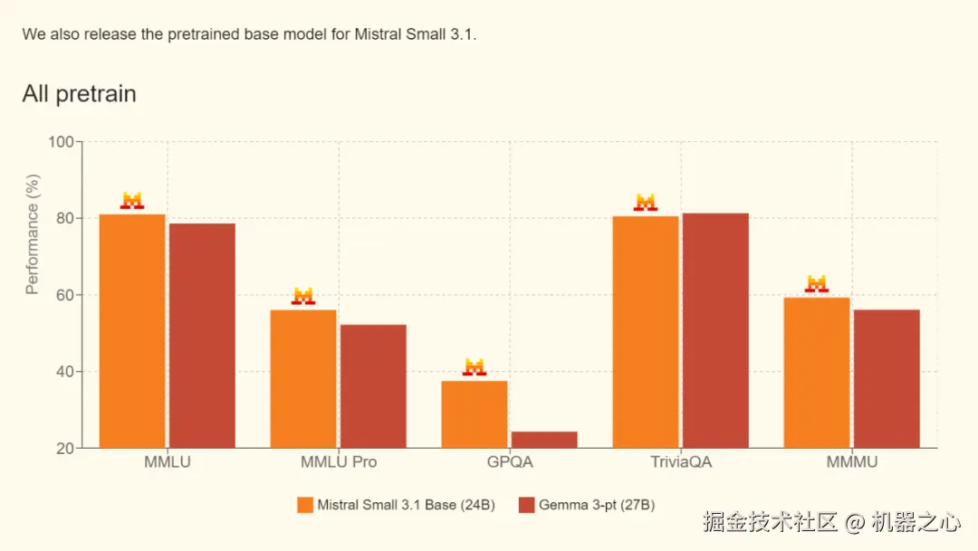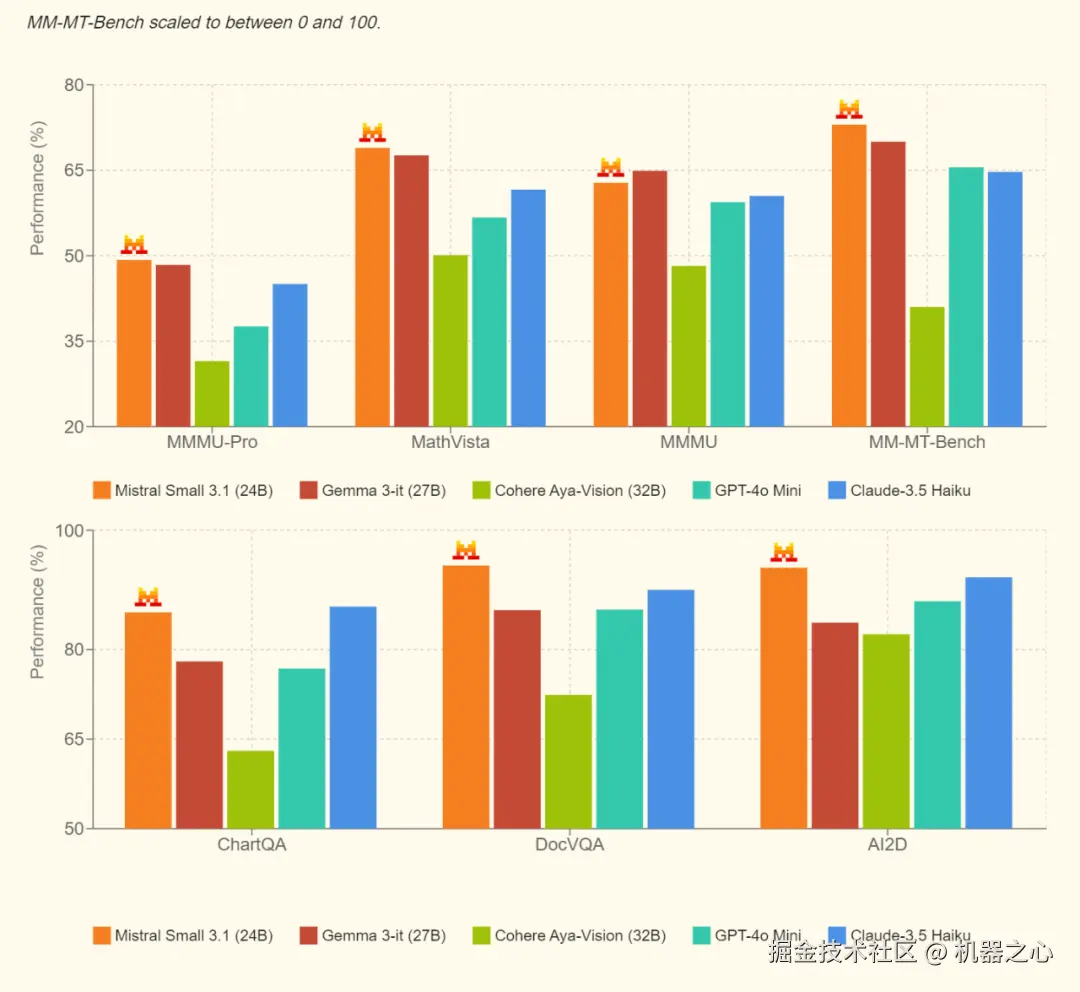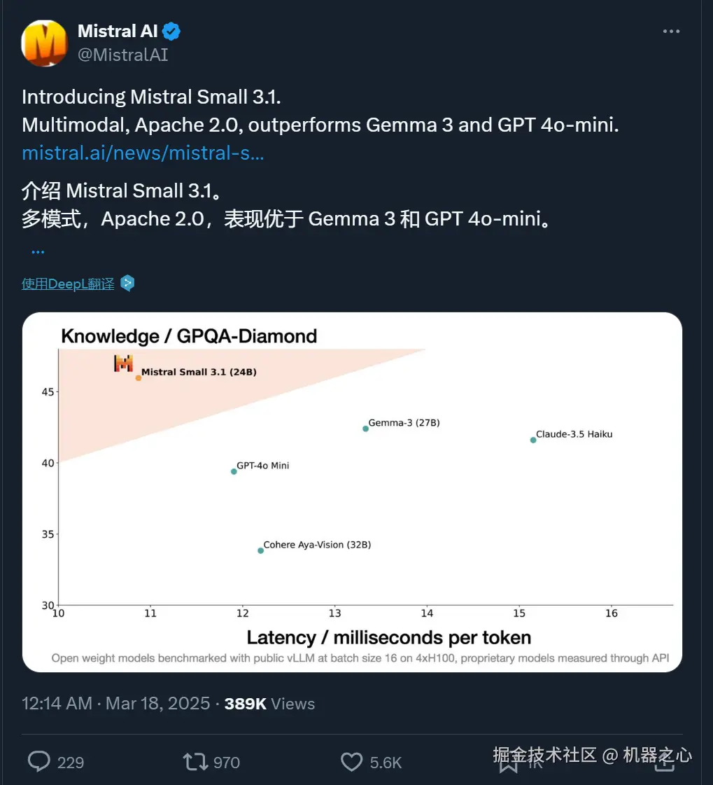 刚刚,法国 AI 创企 Mistral AI 开源了一个 24B 的多模态小模型,该模型在多个基准上击败了 Gemma 3 和 GPT-4o Mini 等同类模型,而且推理速度达到了 150 个 token / 秒,称得上是又好又快。