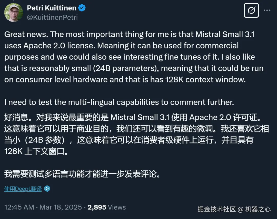 Mistral Small 3.1 可在 huggingface 网站 Mistral Small 3.1 Base 和 Mistral Small 3.1 Instruct 上下载。