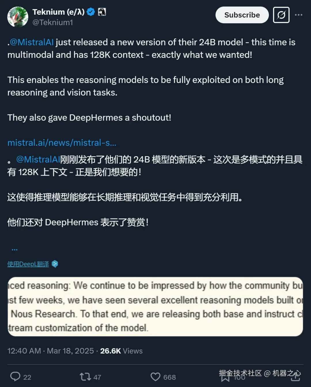 高级推理的基础:开放的 Mistral 模型已经被开发者用来构建出色的推理模型,比如 Nous Research 的 DeepHermes 24B 就是基于 Mistral Small 3 构建出来的。为了鼓励这种创新,Mistral AI 发布了 Mistral Small 3.1 的基础模型和指令检查点,以便社区进一步对模型进行下游定制。