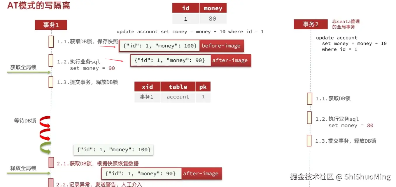 只不过,AT模式需要一个表来记录全局锁、另一张表来记录数据快照undo_log。