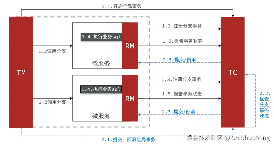 - TM (Transaction Manager) - 事务管理器: 定义全局事务的范围、开始全局事务、提交或回滚全局事务。