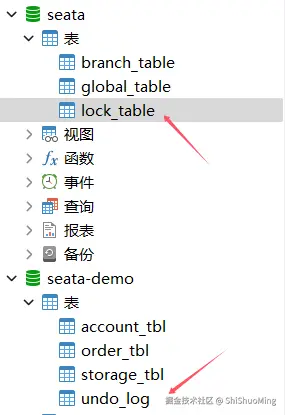 导入Sql文件:seata-at.sql,其中lock_table表导入到TC服务关联的数据库,undo_log表导入到微服务关联的数据库。