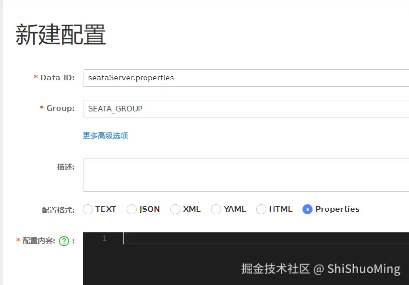 特别注意,为了让tc服务的集群可以共享配置,我们选择了nacos作为统一配置中心。因此服务端配置文件seataServer.properties文件需要在nacos中配好,配置的data id 与 group要与seata配置文件-config中一致。