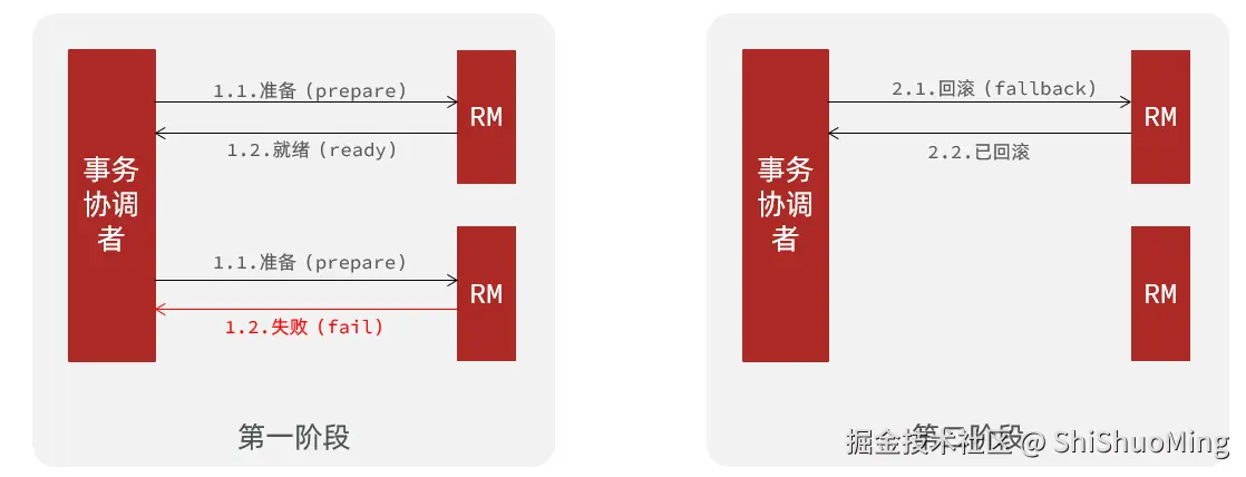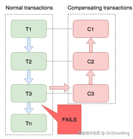 分布式事务执行过程中,依次执行各参与者的正向操作,如果所有正向操作均执行成功,那么分布式事务提交。如果任何一个正向操作执行失败,那么分布式事务会去退回去执行前面各参与者的逆向回滚操作,回滚已提交的参与者,使分布式事务回到初始状态。