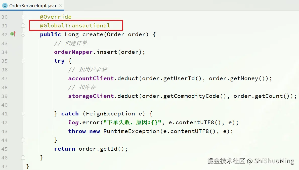 3)给发起全局事务的入口方法添加@GlobalTransactional注解。