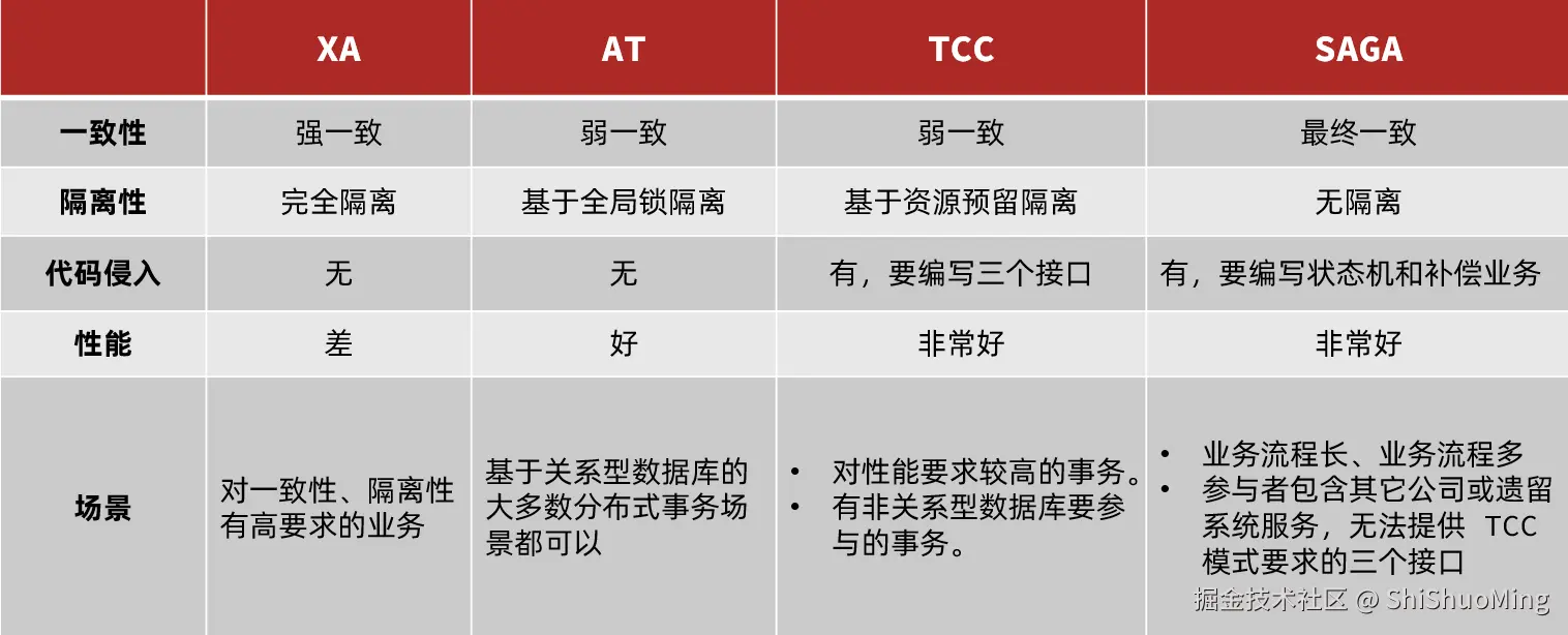 - XA模式:强一致性分阶段事务模式,牺牲了一定的可用性,无业务侵入