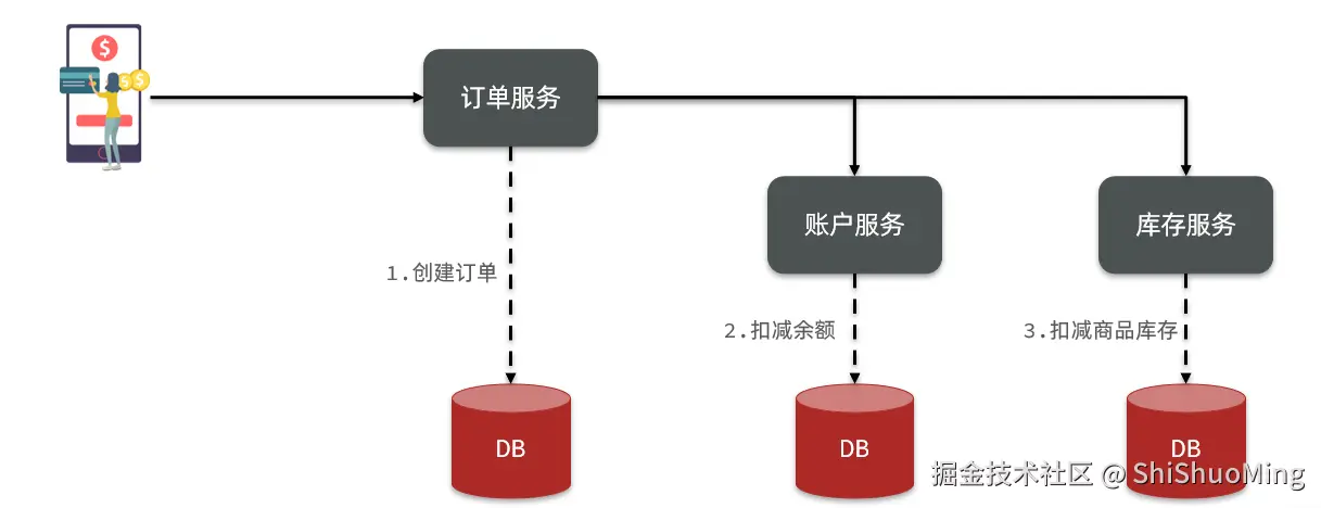 完成上面的操作需要访问三个不同的微服务和三个不同的数据库。
