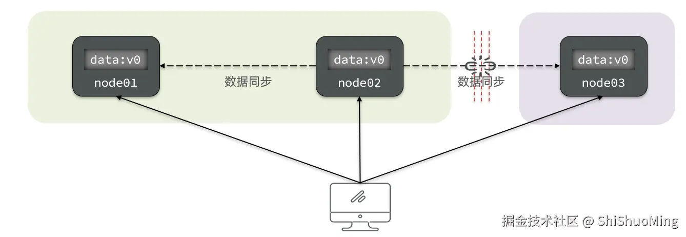 比如现在包含两个节点,其中的初始数据是一致的;当我们修改其中一个节点的数据时,两者的数据产生了差异;要想保住一致性,就必须实现node01 到 node02的数据 同步: