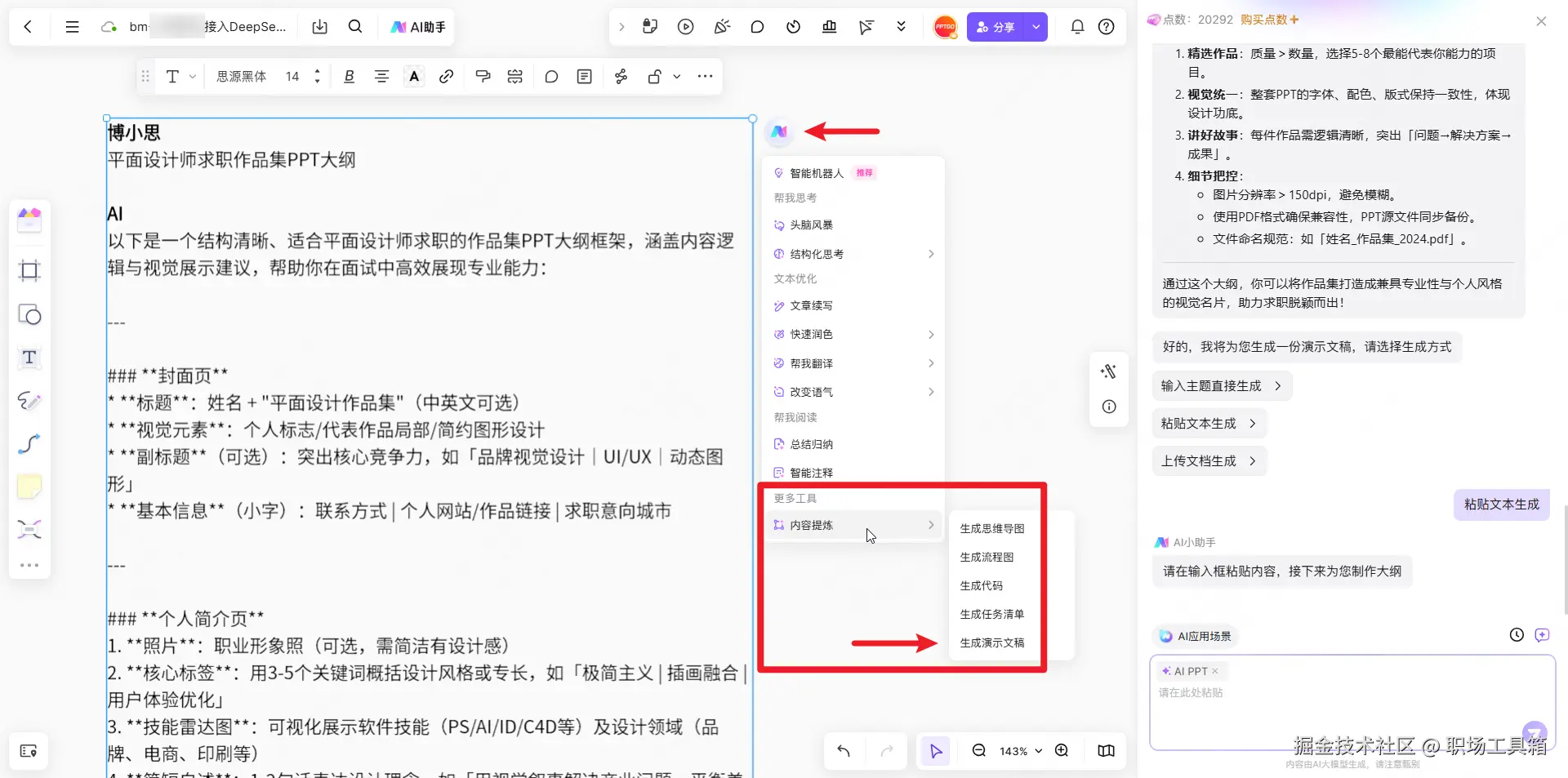 想要DeepSeek生成的PPT大纲转换为PPT演示文稿,可点击“内容提炼 → 生成演示文稿”,借助boardmix AI助手的AI PPT智能体快速生成一份精美的PPT文档。