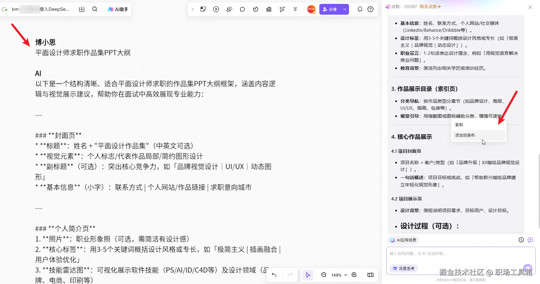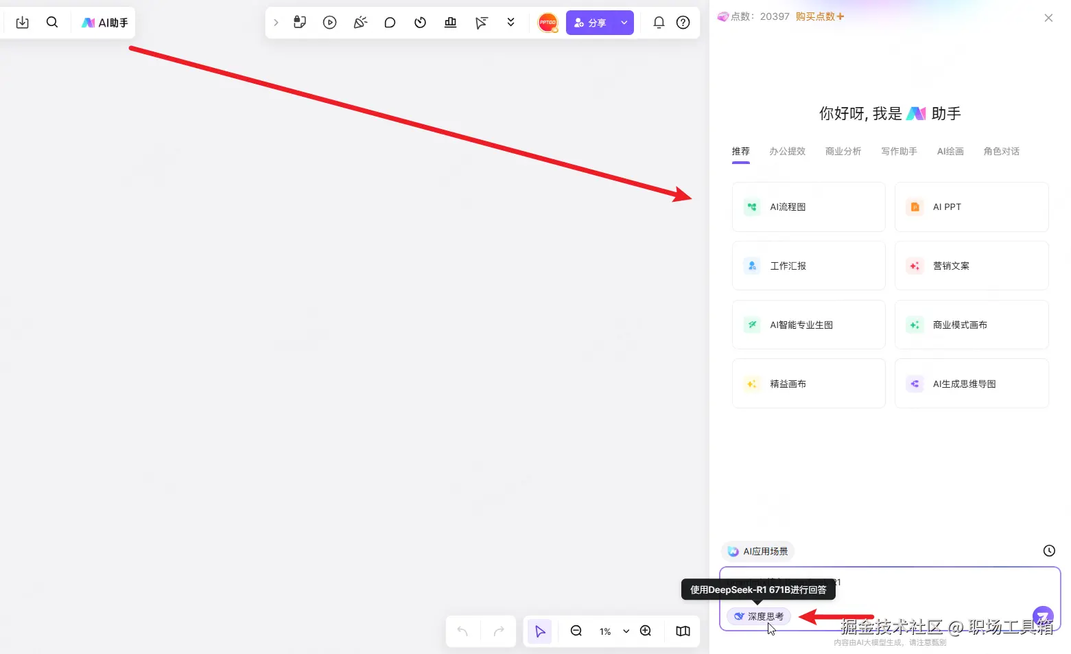 进入boardmix文件,点击左上角的“AI助手”,打开右侧的boardmix AI面板,点击底部输入框左下角的“深度思考”按钮,启用DeepSeek,在输入框内输入内容,按下回车,就能使用DeepSeek满血版辅助我们完成各种任务。