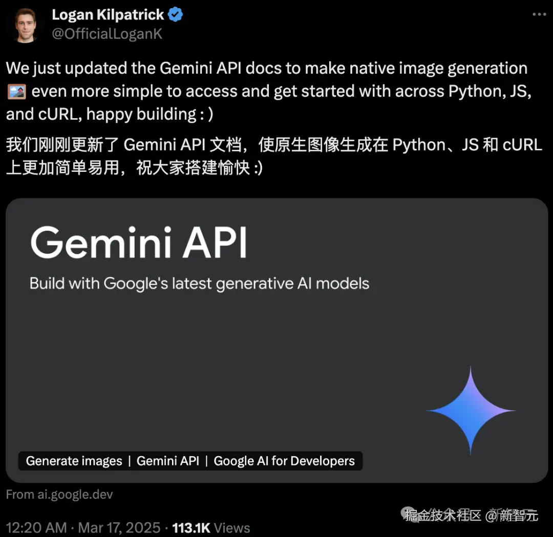 Gemini API 的开发者 Logan Kilpatrick,宣布 Gemini API 文档已更新,使用代码也可以生成图像了。