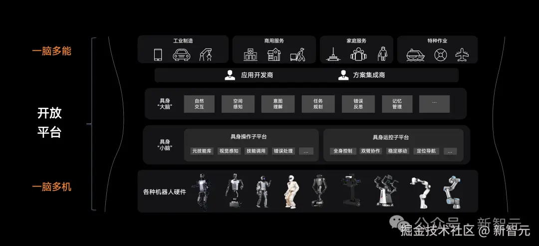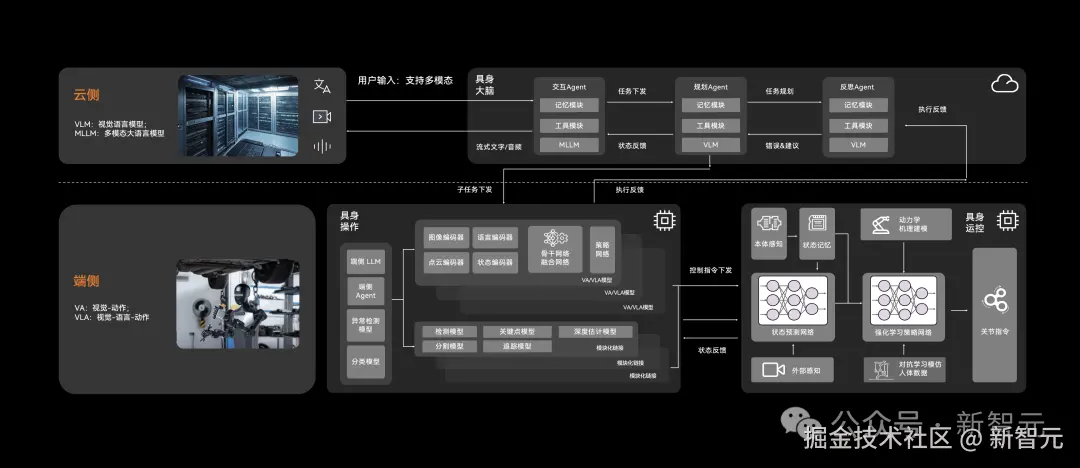 具身「大脑」具备自然交互、空间感知、意图理解、分层规划和错误反思等能力,具身「小脑」通过元技能库和动态控制实现动作执行,形成从具身「大脑」进行任务规划,再调用具身「小脑」技能库执行具体动作,并将执行反馈传递给具身「大脑」的完整任务闭环。