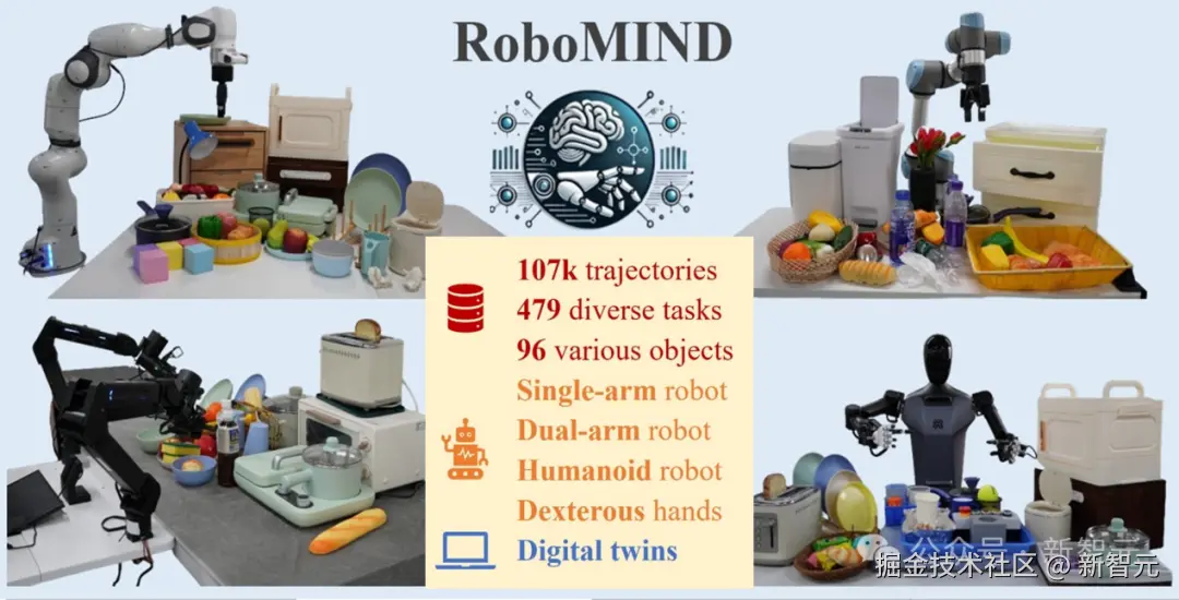 2024 年 12 月,北京人形机器人发布了大规模多构型具身智能数据集和 Benchmark——RoboMIND[4],作为业内首个经由多类视觉语言动作(VLA)及端到端模型充分验证的跨本体标准化大规模数据集,包含 10.7 万条机器人轨迹数据,涉及多达 479 项不同的任务,涵盖了 96 种不同的物体,覆盖了家居、厨房、工厂、办公、零售等大部分生活服务场景,具备高度的通用性和可扩展性,为「慧思开物」提供了从任务理解到操作执行的全流程数据支持。
