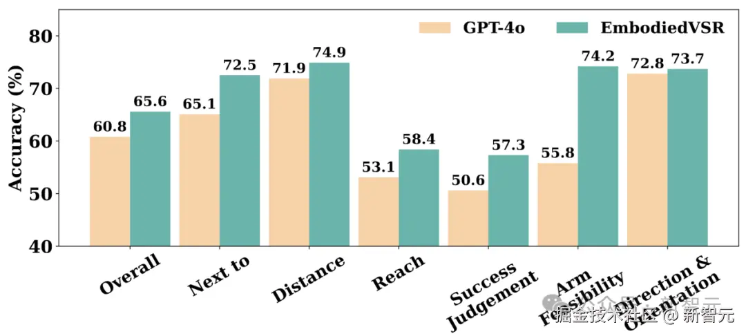 除了视觉语言问答相关评测之外,北京人形机器人还构建了适用于具身智能的评测集,能够在空间相对位置、距离、成功失败判断、可达性以及可操作性等维度进行了评估,采用「慧思开物」具身智能平台相比单纯调用 GPT-4o 等多模态模型在具身智能能力上也有很大提升**。**