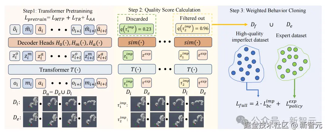 此外,为了更好地实现操作过程中的抗干扰能力和错误恢复能力,北京人形机器人技术团队提出了一种自监督数据过滤框架(SSDF)[2] 从失败数据中提取有价值的信息。该框架通过结合专家数据和失败数据来计算失败轨迹段的质量分数,并筛选出高质量的失败数据片段用于训练。