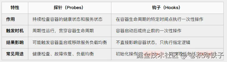 - 钩子与主进程的关系: 钩子运行与容器主进程无直接依赖关系。PostStart 并不阻塞主进程启动,而 PreStop 是在终止信号发送后触发。