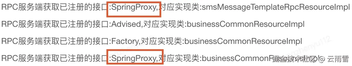 这里牵出第二个问题点,为什么只能配接口?因为服务端代码里如上图,存入的服务映射信息的Key是取的接口,而不是具体的实现类,因此客户端必须和服务端的Key保持一致。同时也跟出一个新的问题,为什么服务端要存接口而不是具体的实现类?答案是如果出现多实现的情况下,暂时还没有开发相关找具体实现的功能,当前情况下因为存的接口,会存在实现类先后顺序的覆盖问题。