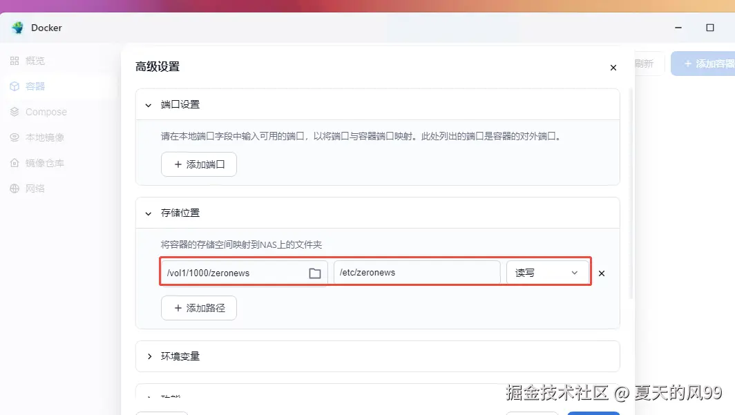 设置挂载 zeronews 容器的路径为 /etc/zeronews, 权限设置为 读写