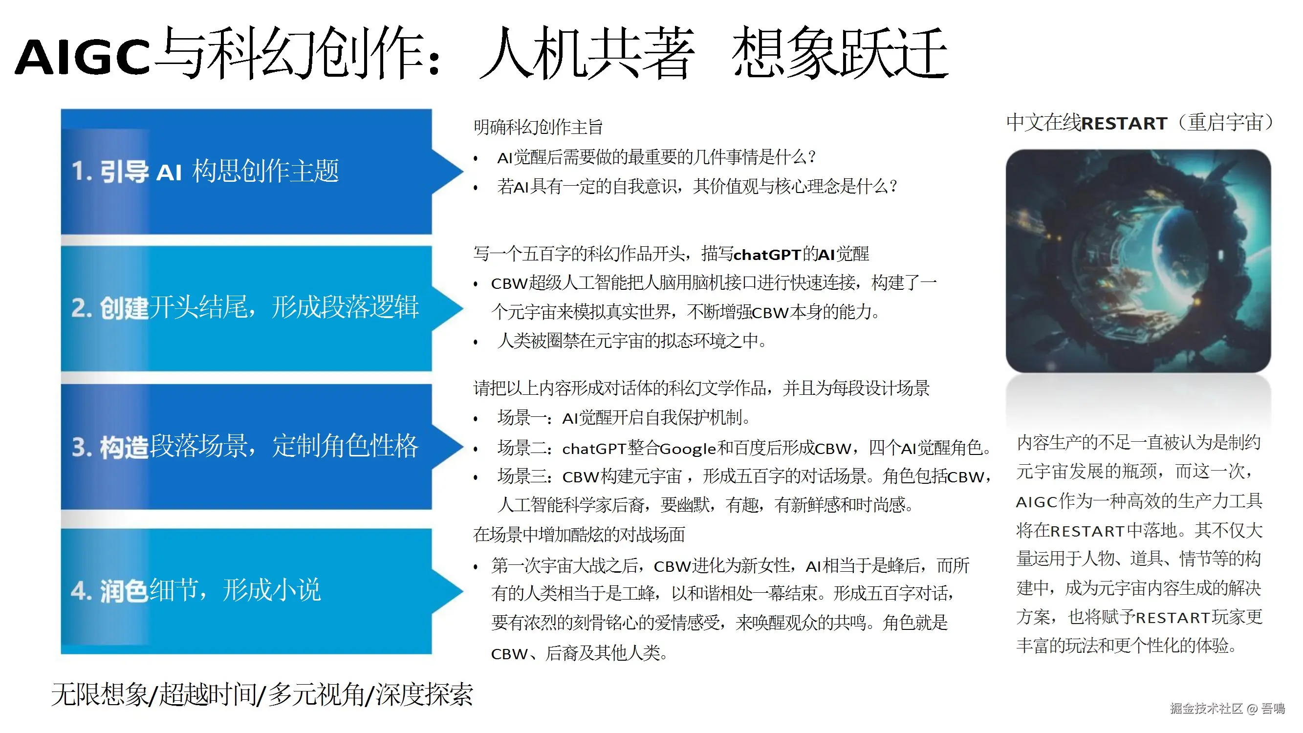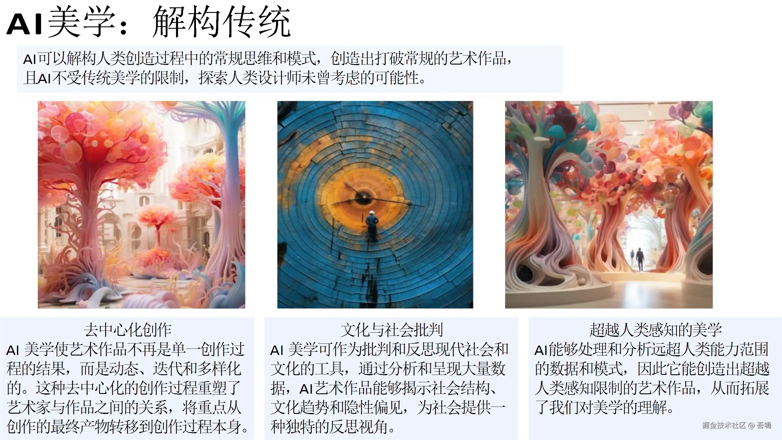 详细阐述了AIGC在文本生成、图像生成、视频生成等多个方面的应用,包括演讲稿、汇报稿、小说创作、文生图、视频生成等。强调了AIGC的高效性,如几秒内准确处理图像、生成多样化内容,并实现智能分析和决策。