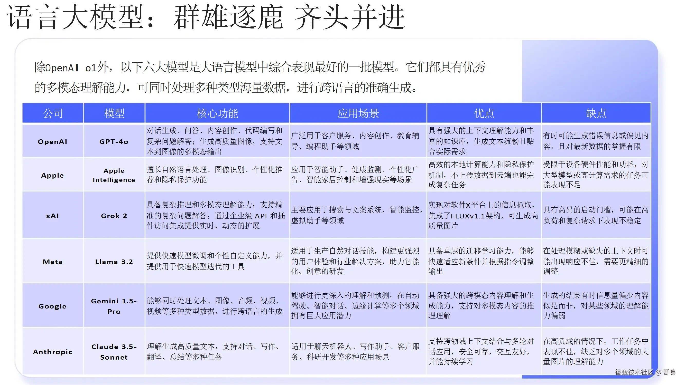 介绍了OpenAI及其核心宗旨,以及AI基座模型的演进过程,包括从文本生成到视频生成,再到逻辑推理领域的进步。同时,列举了当前表现优秀的大语言模型,如GPT-4、Apple Intelligence等,以及音乐大模型Suno的领先地位。