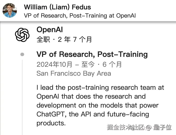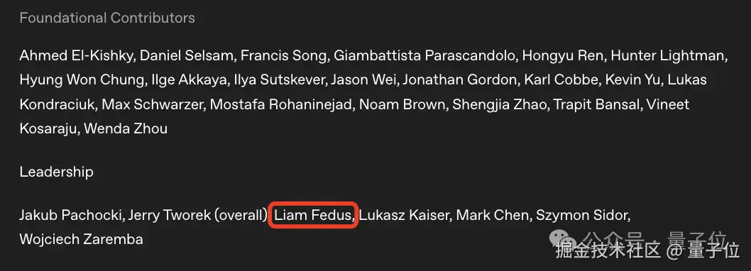 没错,彼时 OpenAI 的上一任后训练负责人 Barret Zoph 等人刚刚跟着 CTO Mira 跑路。在那一拨人才离职潮中,William (Liam) Fedus 是顶上重任的主要角色之一。