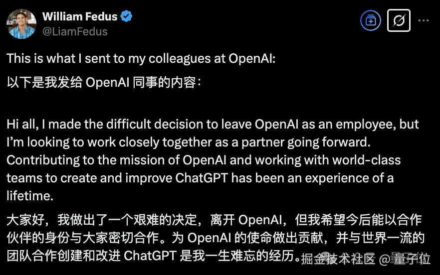 CTO Mira 卷着一票人才集体出走之后,刚刚,后训练研究副总裁 William Fedus 也官宣离职创业了。