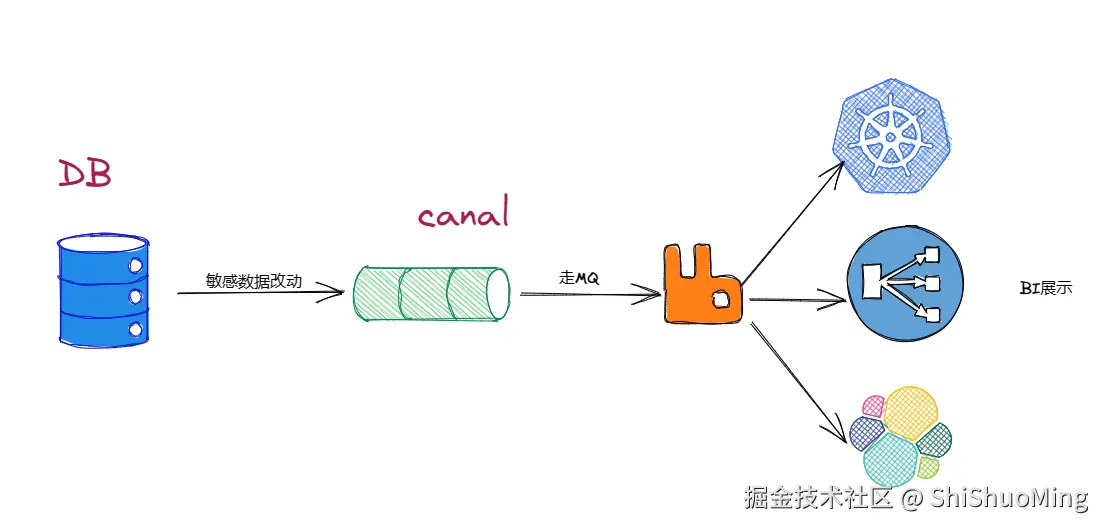 大白话: Canal 感知到MySQL数据变动,然后解析变动数据,将变动数据发送到MQ或者同步到其他数据库,等待进一步业务逻辑处理。