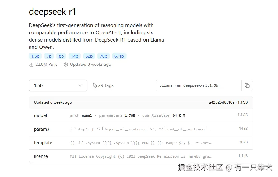 在ollama官网,搜索我们要部署的模型,这里选择deepseek-r1模型,可以看到列出所有蒸馏版本,我们这里由于配置原因,选择1.5b版本。