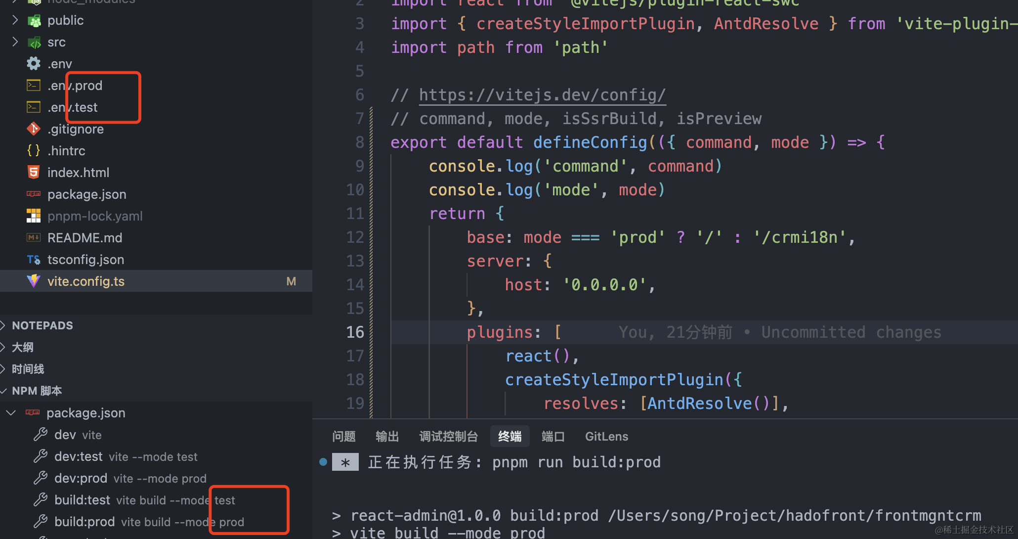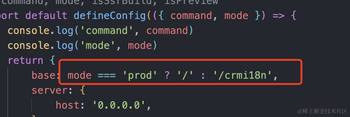 其中 command, mode, isSsrBuild, isPreview 参数分别代表不同的编译命令/编译模式/是不是ssr/是不是preview,command就是dev / server / build等,mode就是配置的 test / prod 或者是默认的模式,例如: