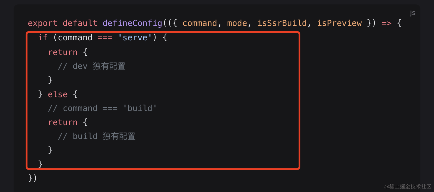 如果配置文件需要基于(serve 或 build)命令或者不同的 模式 来决定选项,亦或者是一个 SSR 构建(isSsrBuild)、一个正在预览的构建产物(isPreview),则可以选择导出这样一个函数: