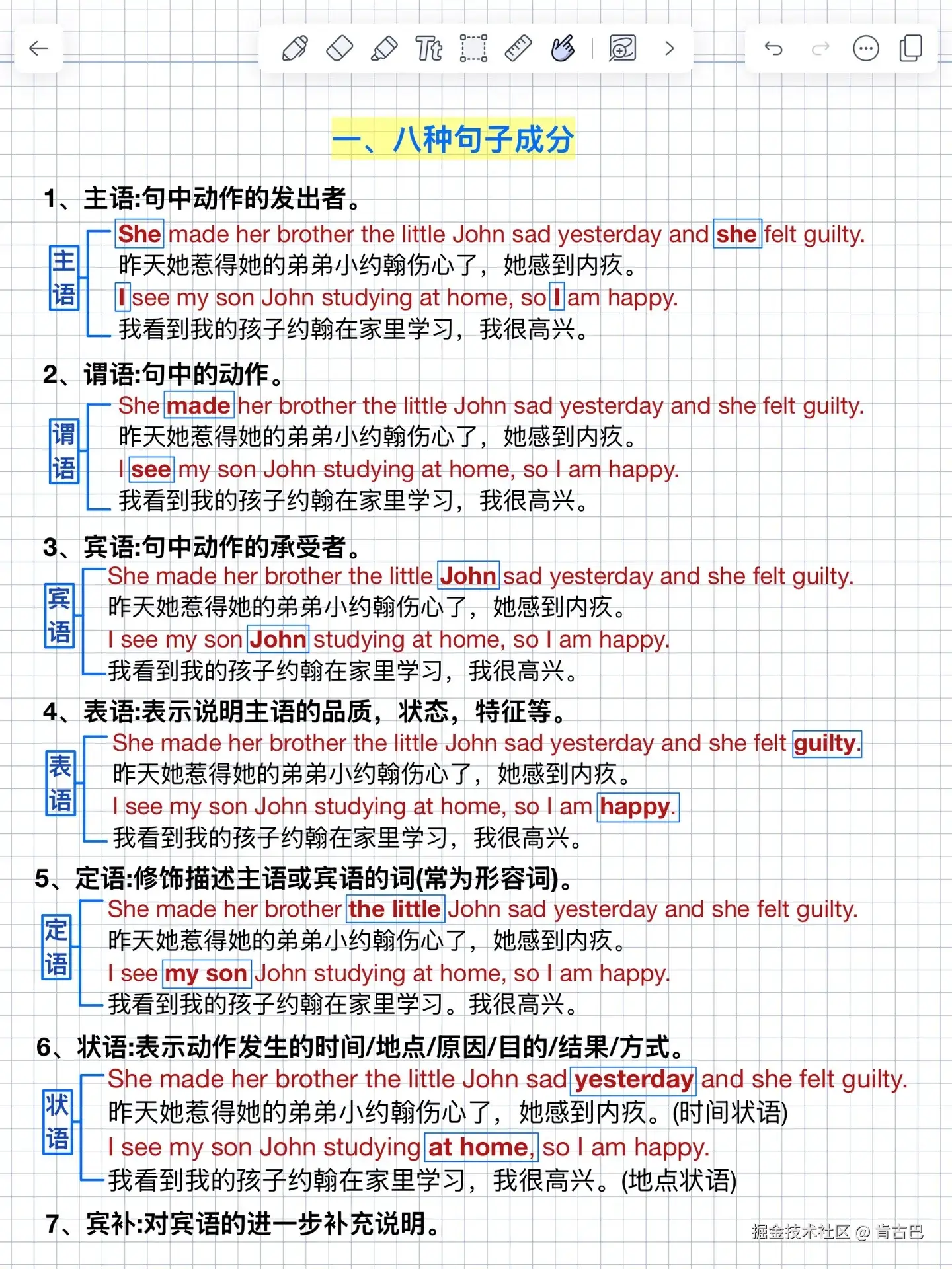 | 人称代词 (Personal Pronouns) | 主格 (Subjective Case): 在句子中作主语。markdown I (我):I am a student. (我是一名学生。) you (你/你们):You are kind. (你/你们很友善。) he (他):He is tall. (他很高。) she (她):She is beautiful. (她很漂亮。) it (它):It is raining. (正在下雨。) we (我们):We are friends. (我们是朋友。) they (他们/她们/它们):They are playing football. (他们/她们/它们在踢足球。) | 人称代词根据人称(第一、第二、第三人称)、数(单数、复数)和格(主格、宾格)的不同而变化。 |