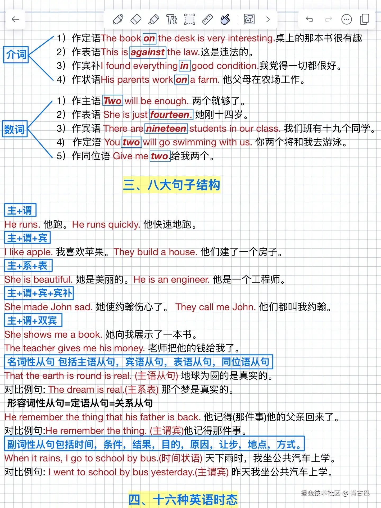 | 系动词 (Linking Verbs) | 1. 什么是系动词? 定义: 系动词是一种特殊的动词,它不表达具体的动作,而是用来连接主语和表语(通常是名词或形容词),以描述主语的状态、特征或身份。 作用: 系动词就像一座桥梁,将主语和表语联系起来,共同构成一个完整的句子。 常见系动词: + 最常见的系动词是“be”动词(am, is, are, was, were, - "She is a teacher."(她是一位老师。)——"is"是系动词,连接主语"she"和表语"a teacher"。 - "They were happy."(他们很快乐。)——"were"是系动词,连接主语"they"和表语"happy"。 - "To be or not to be, that is the question."(生存还是毁灭,这是一个问题)——"to be"是不定式做系动词,连接主语"that"和表语"the question"。 其他常见的系动词包括: + 感官动词(look, smell, taste, feel, sound)。 - “look”和“smell”后面通常接形容词,而不是副词。这是因为形容词用来描述主语的状态,而副词用来描述动作 java ■ "She looks happy."(她看起来很高兴。) ■ "The sky looks cloudy."(天空看起来多云。) ■ "This food looks delicious."(这个食物看起来很美味。) ■ "The flowers smell sweet."(这些花闻起来很香。) ■ "Something smells burning."(有东西闻起来烧焦了。) ■ "The kitchen smells good."(厨房闻起来很香。) - 实义动词区分: “look”和“smell”也可以作为实义动词使用,表示具体的动作。* 实义动词“look”:表示“看”的动作,例如:“He looked at the picture.”(他看了那幅画。) * 实义动词“smell”:表示“闻”的动作,例如:“She smelled the rose.”(她闻了那朵玫瑰。) - like的用法: 当要表达“看起来/闻起来像……”时,可以使用“look/smell like + 名词”。 java ■ "It looks like rain."(看起来像要下雨。) ■ "It smells like coffee."(闻起来像咖啡。) + 表变化动词(become, get, grow, turn)+ 保持状态动词(remain, keep, stay) + 似乎动词(seem, appear) | |