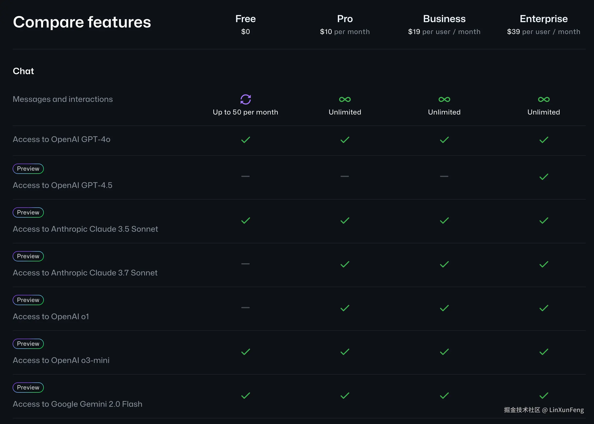对于免费用户,Copilot 提供了每个月 2000 次的代码补全,和 50 次的模型使用。