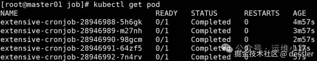 每一个Cronjob实际上执行一次就等于创建了一个Job。如果Job正常执行完成则pod的状态也是正常退出的Completed。