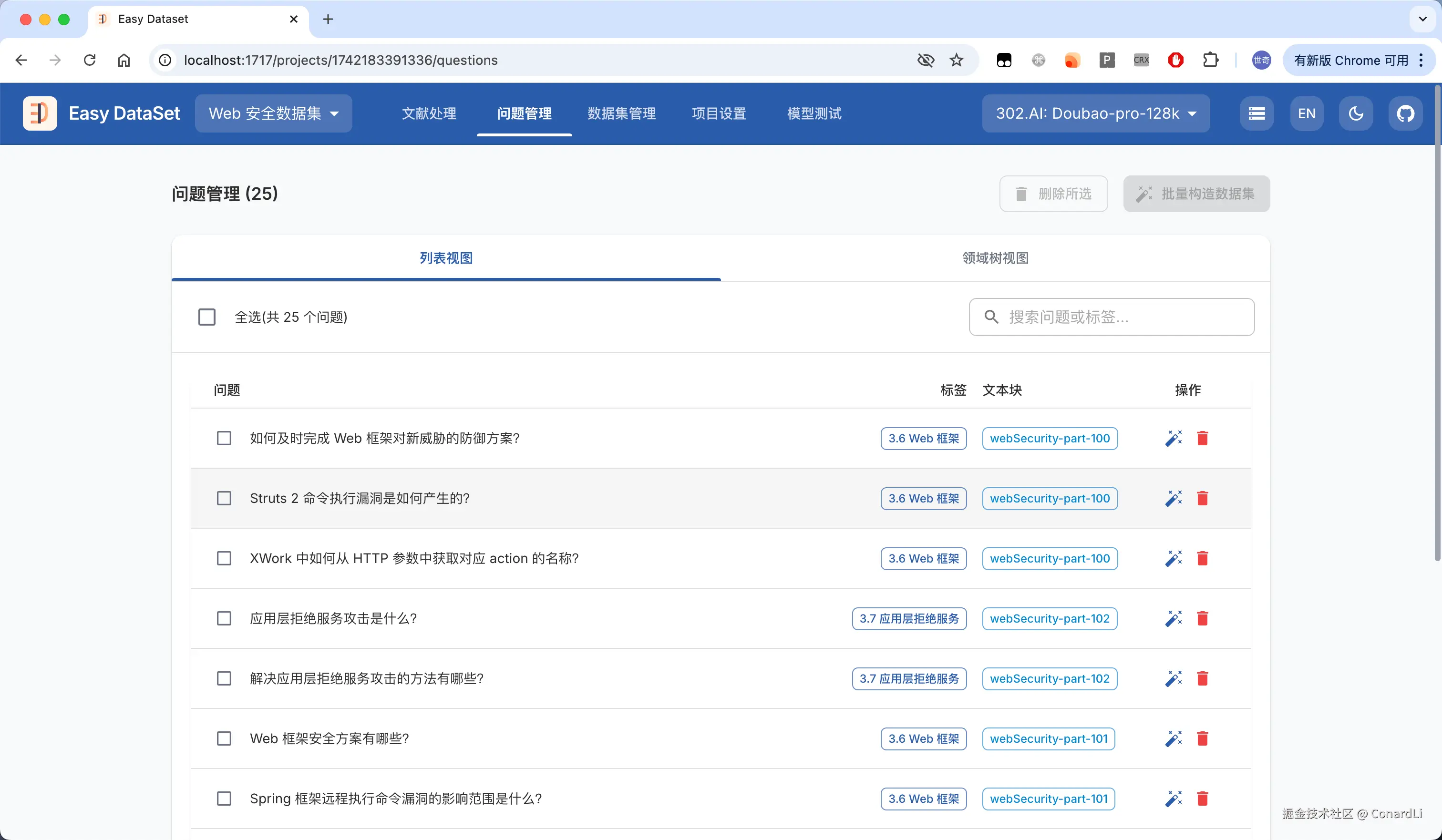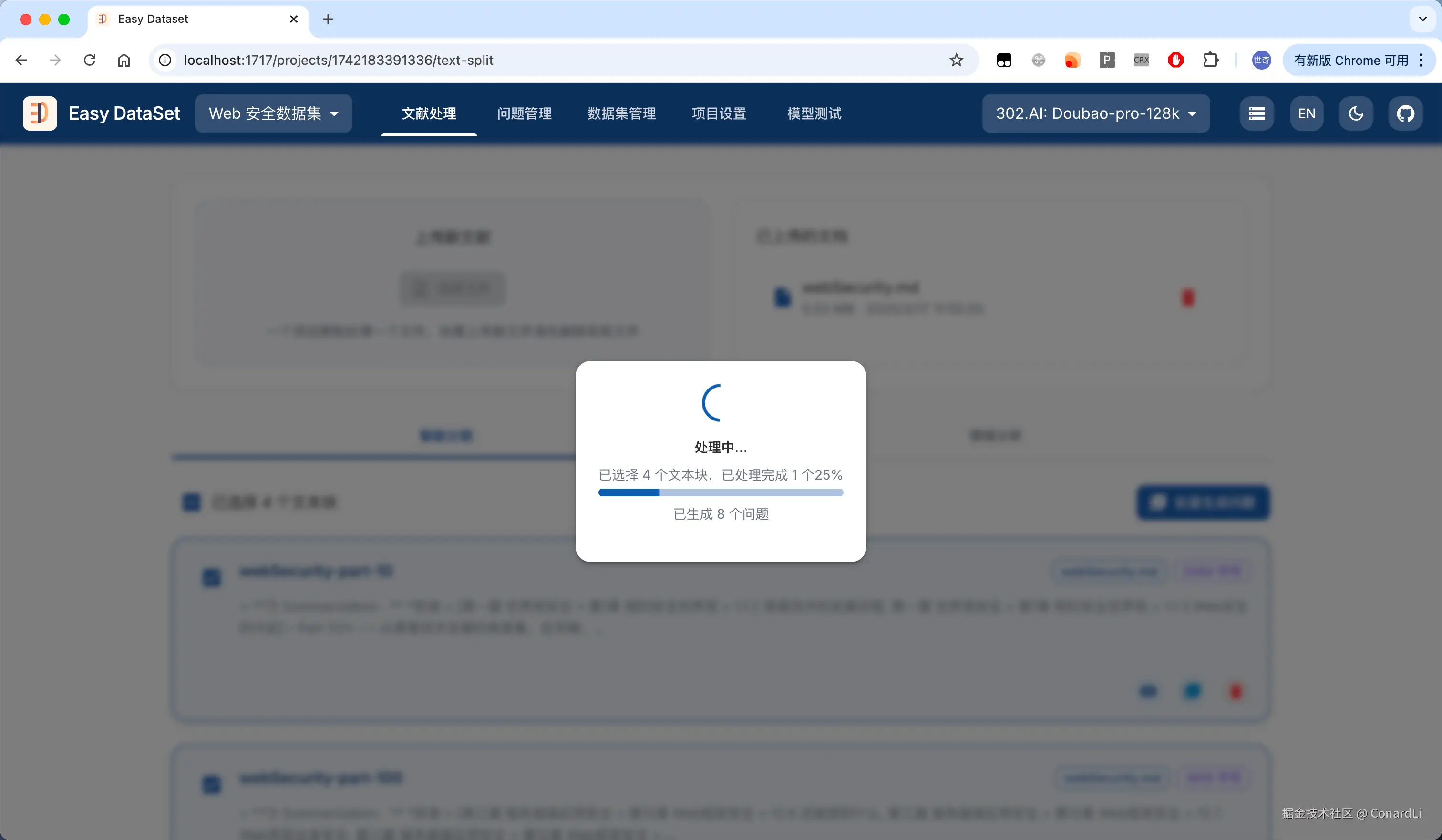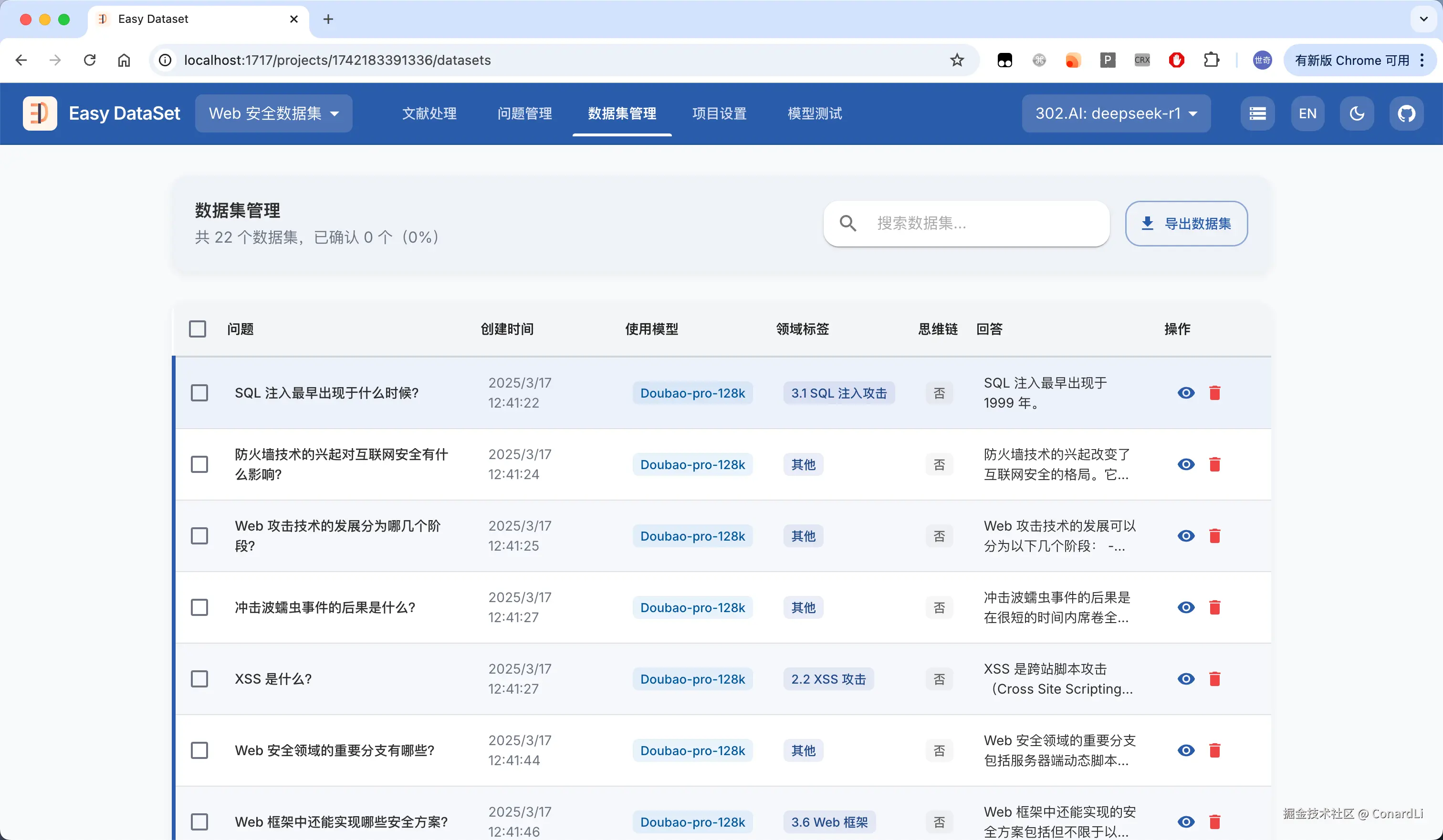 目前市面上确实没有一款工具可以满足这样的需求,因此,借助 AI,我大概花了 3 个晚上的时间构建出了 Easy DataSet(github.com/ConardLi/ea…