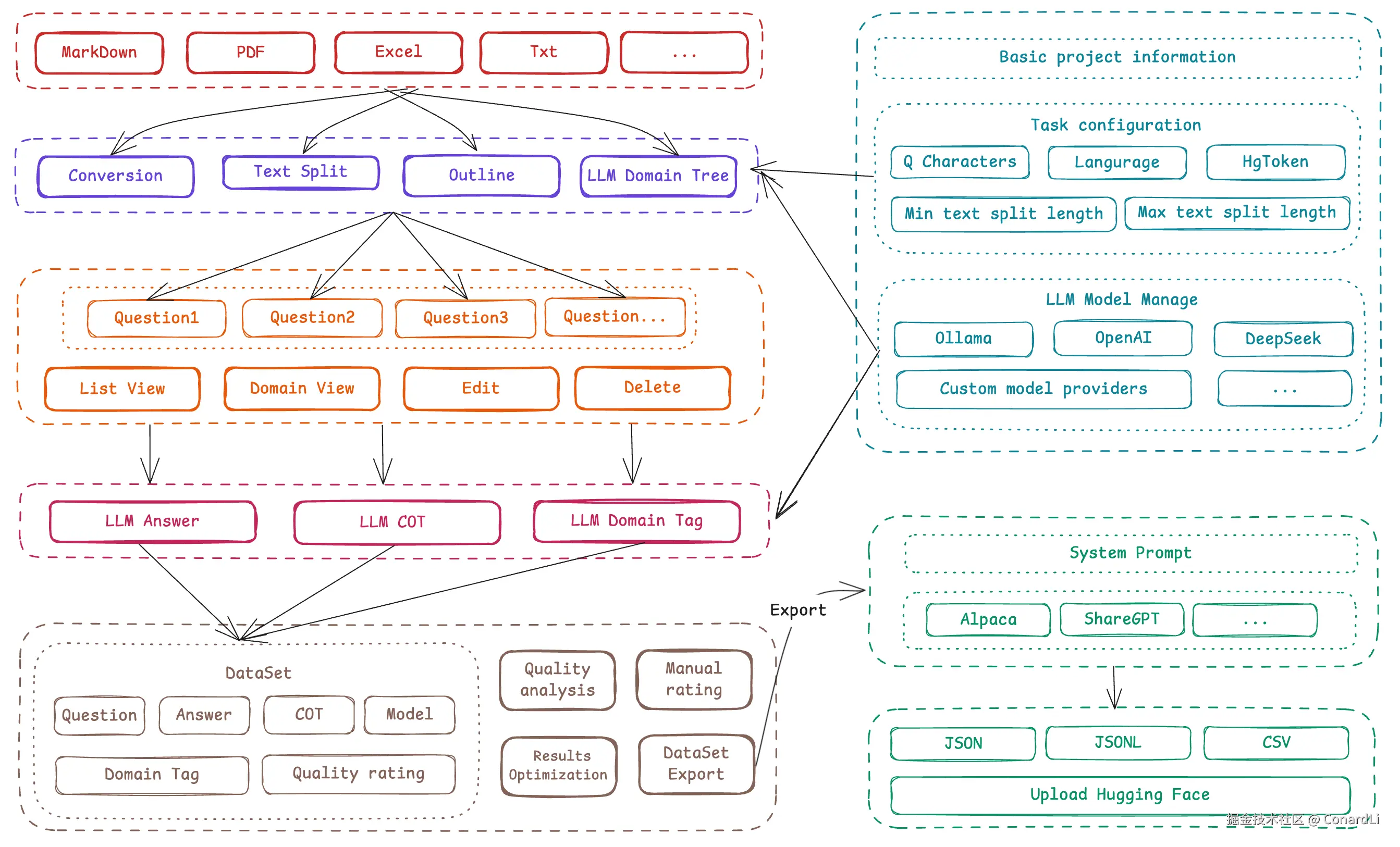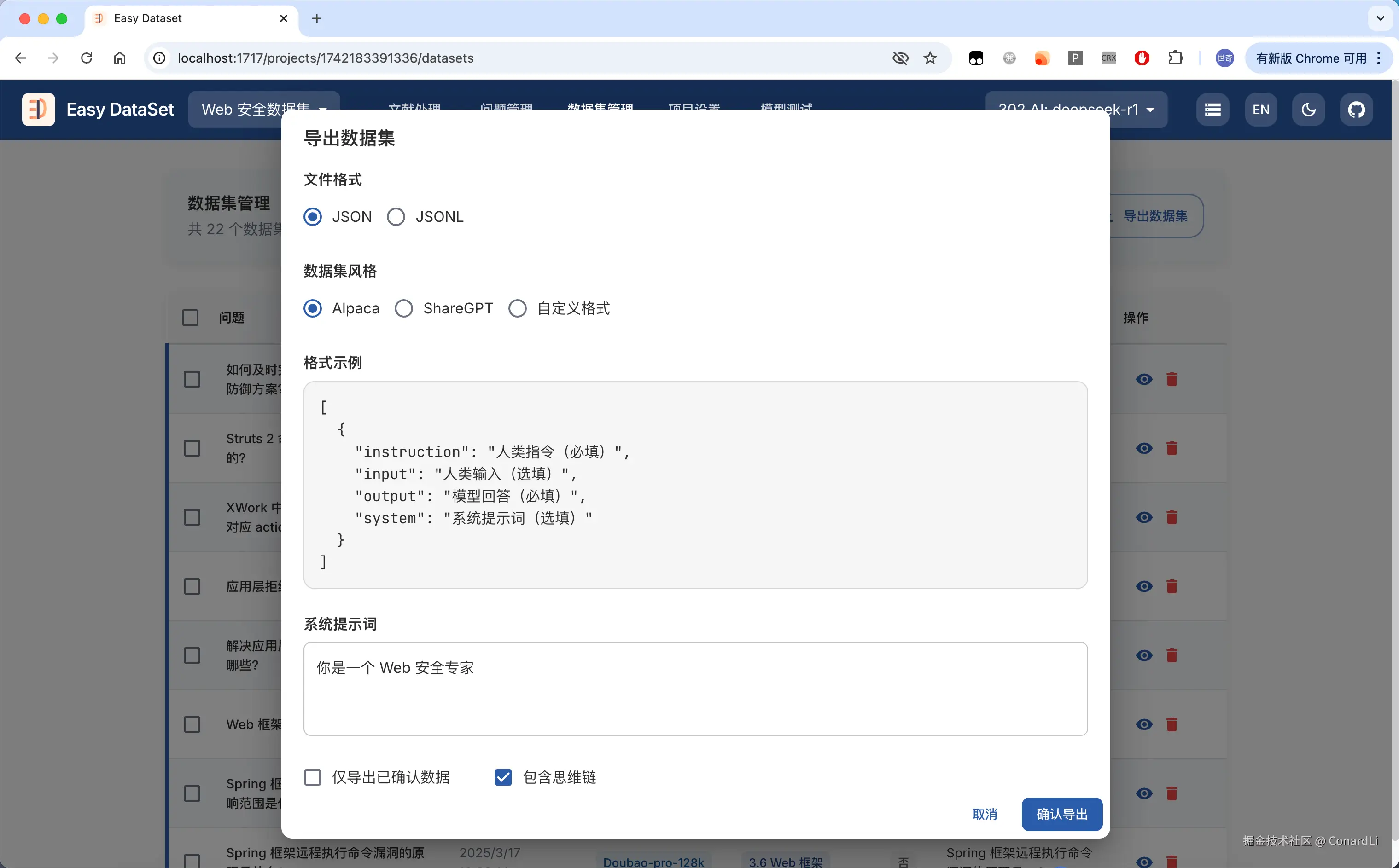- 多格式导出:支持Alpaca、ShareGPT标准格式,自定义字段映射,包含领域标签与 COT 信息。