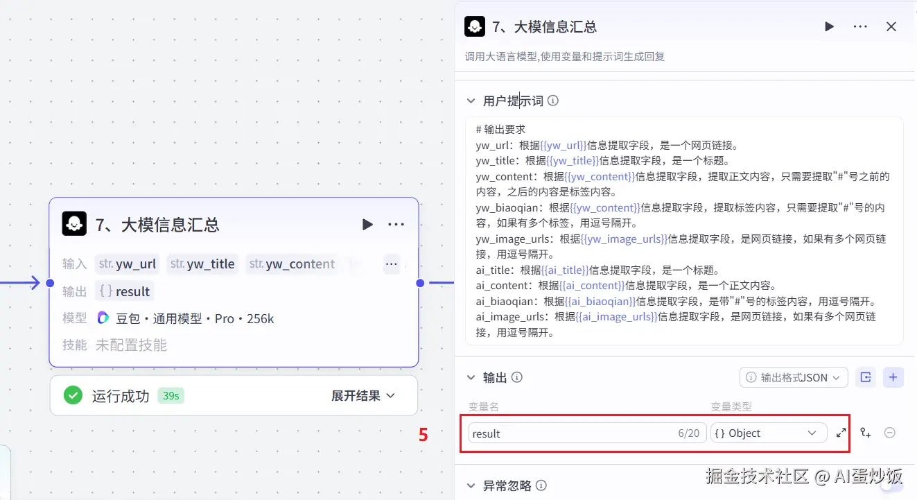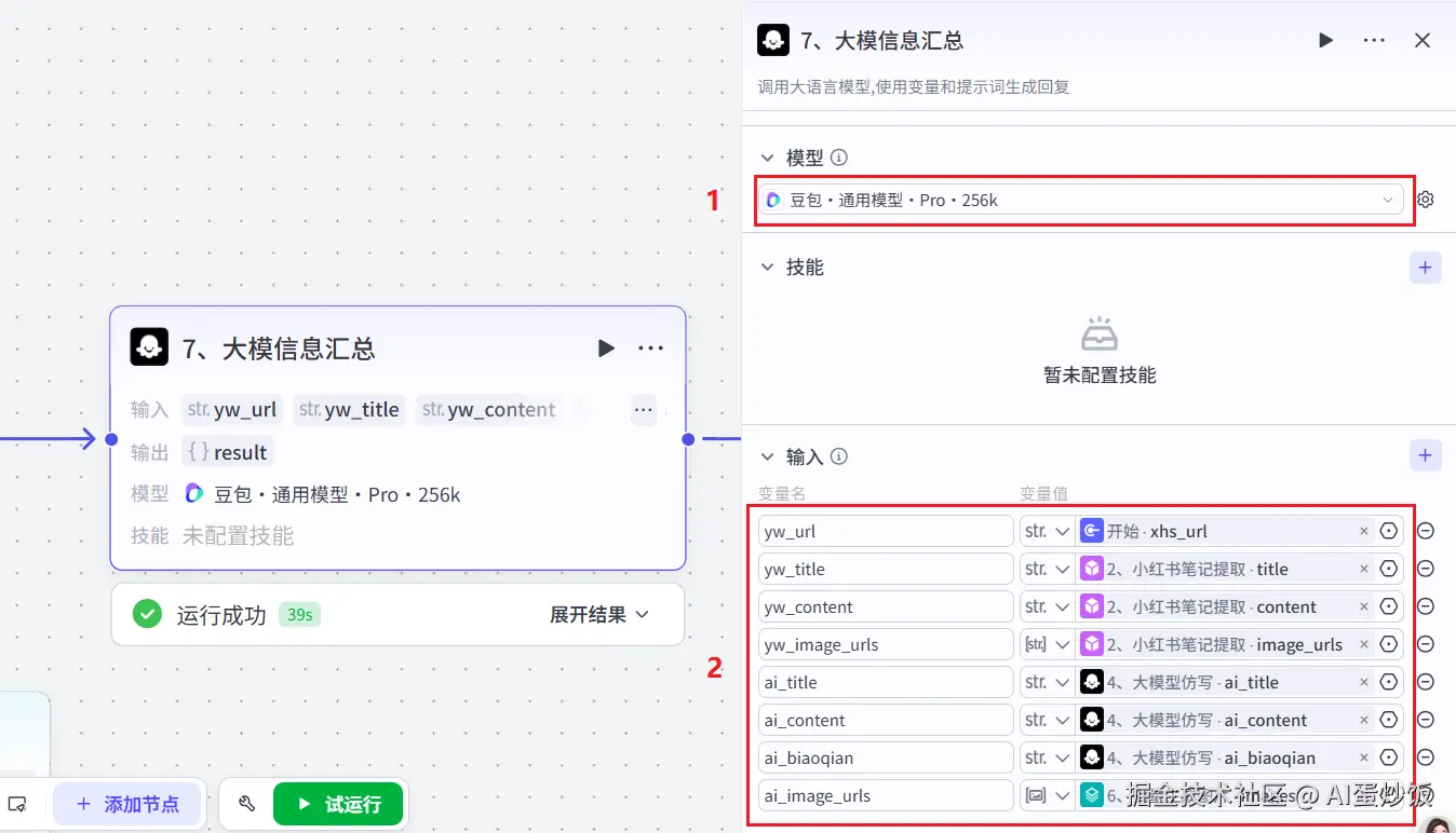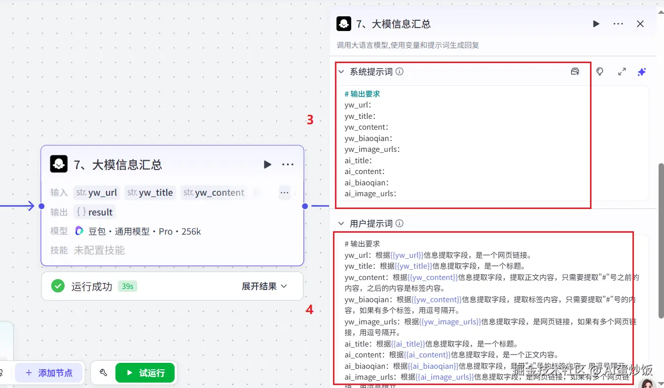 为了保证完整输入和输出,大模型选用 「豆包·通用模型·Pro·256k」