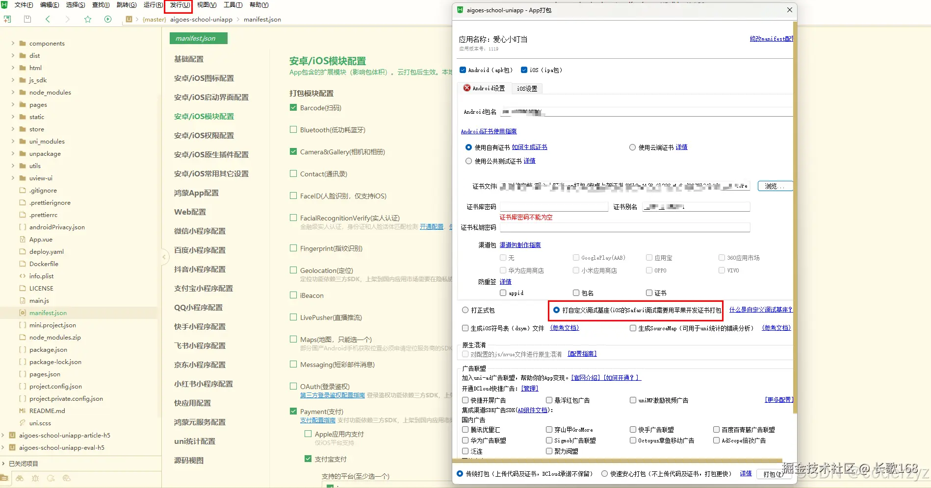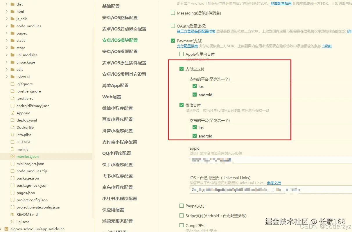 1、首先支付功能需要到manifest.json文件中,在安卓/ios模块配置中,开启Payment(支付),根据自己的需求开启,如果是微信支付appid必须和微信开放平台一样。