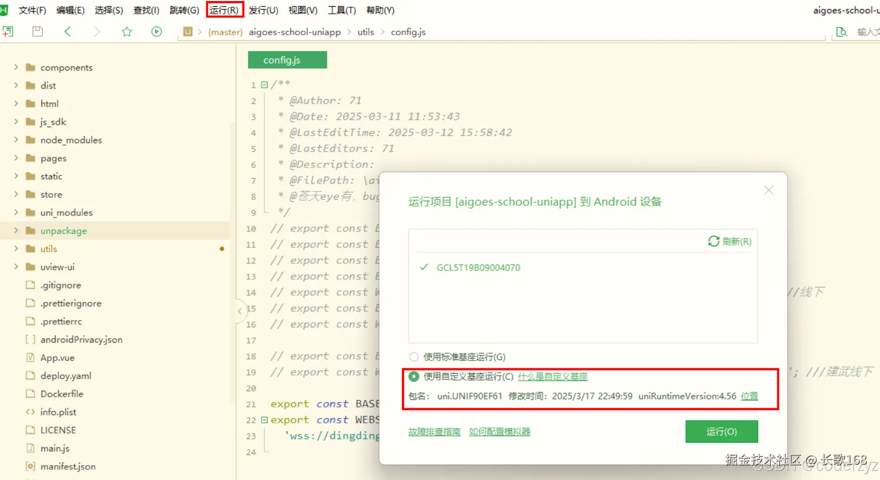 这时你就可以勾选自定义基座,测试微信支付了。一般如果你是真机调试,这里可以直接连接上你的设备。