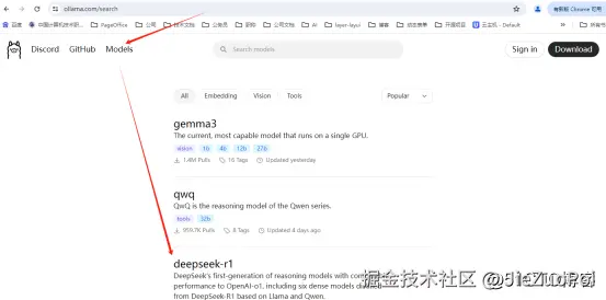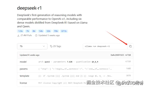 还是在ollama官网上,点击Models,选择deepseek-r1,不同版本对应的体积大小不同,体积越大模型越精细化,只需要复制命令即可,我这里选择7b