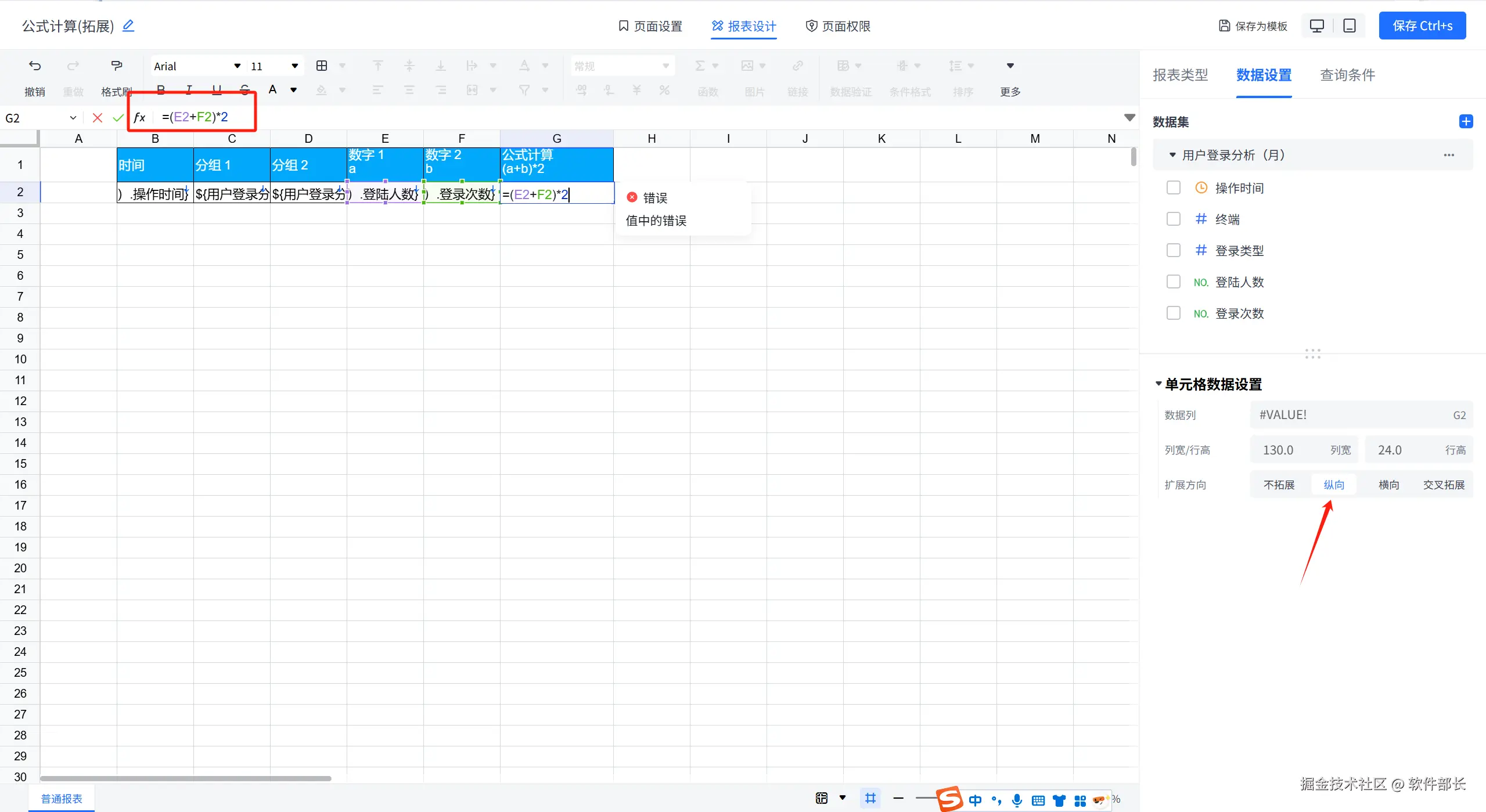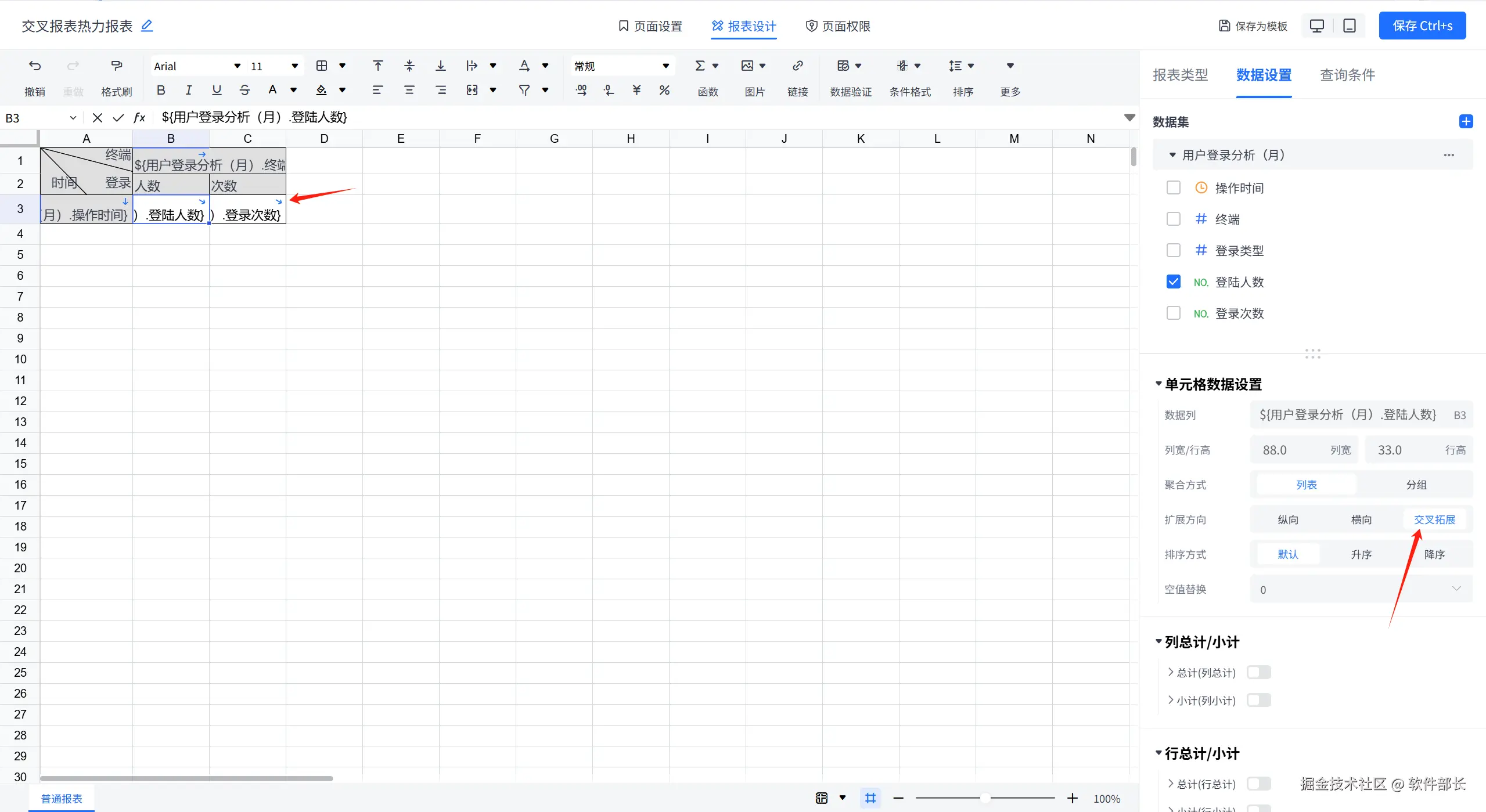 3、交叉报表支持公式,如下图所示,交叉报表中,公式的拓展方式配置为交叉拓展。